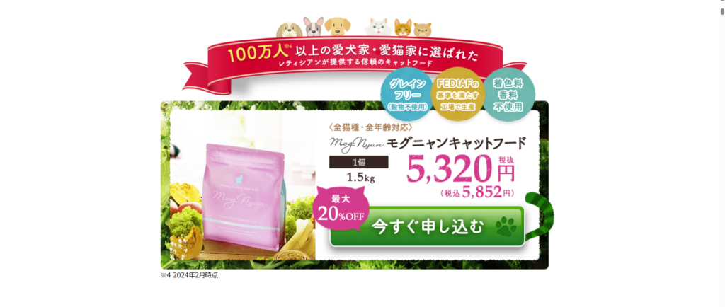 - 定期便では20%OFFがずっと続き、獣医師オンライン相談無料などの特典付き
