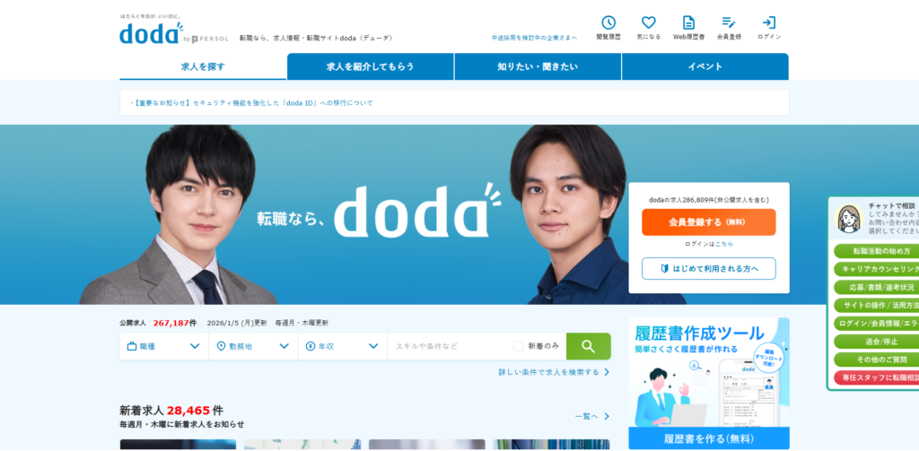 また、情報量を重視する方には求人検索と相談の両方が使えるdodaが便利です。