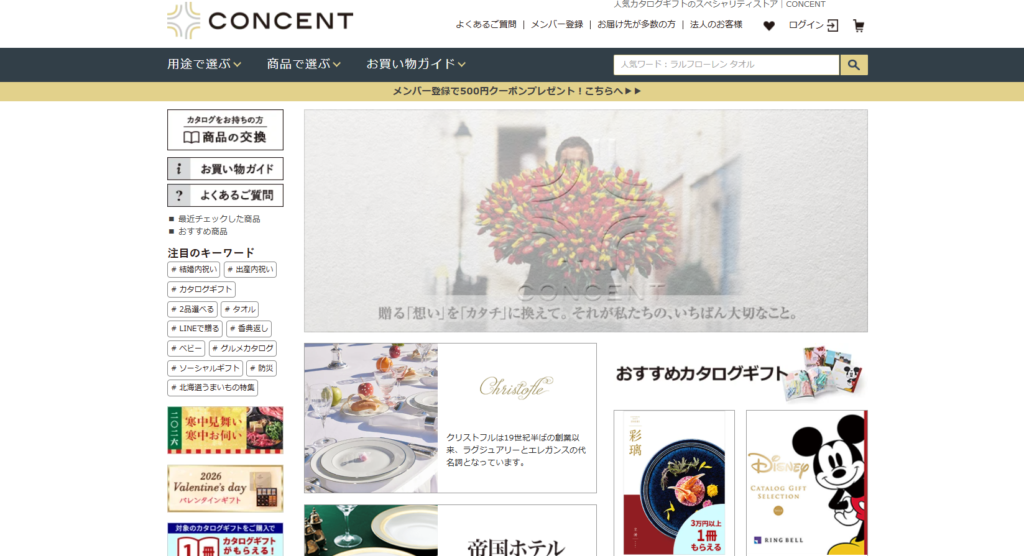 CONCENTは、定番ギフトに“センス”を求める人にぴったりのサイトです。幅広いラインナップの中でも、グルメ・コスメ・ライフスタイル雑貨など、女性目線で選ばれた商品が豊富。ギフト包装やメッセージカードの質も高く、贈る人の心を丁寧に届けられます。特に、結婚・出産祝いなど「相手の印象に残る贈り物」を探す方におすすめです。