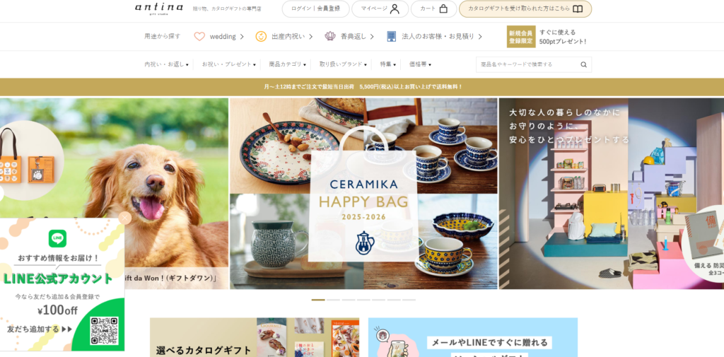 アンティナギフトスタジオは、デザイン性と品質の高さで注目を集めるギフト通販サイトです。世界中からセレクトしたブランドギフトや、上質なカタログギフトが豊富に揃い、雑誌のような美しいデザインカタログも人気。おしゃれで洗練された印象を重視したギフト選びができます。特に女性同士の贈り物やお祝いにぴったりです。