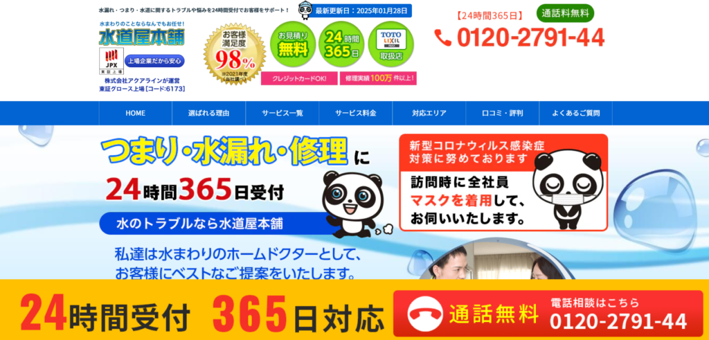 水道屋本舗は、全国対応の水回り修理専門業者。トイレ、キッチン、浴室、給湯器など幅広く対応し、24時間体制でサポートしています。到着までのスピードが早く、修理前の説明が丁寧と評判。見積もり時の料金提示も明確で、初めてでも安心して利用できます。