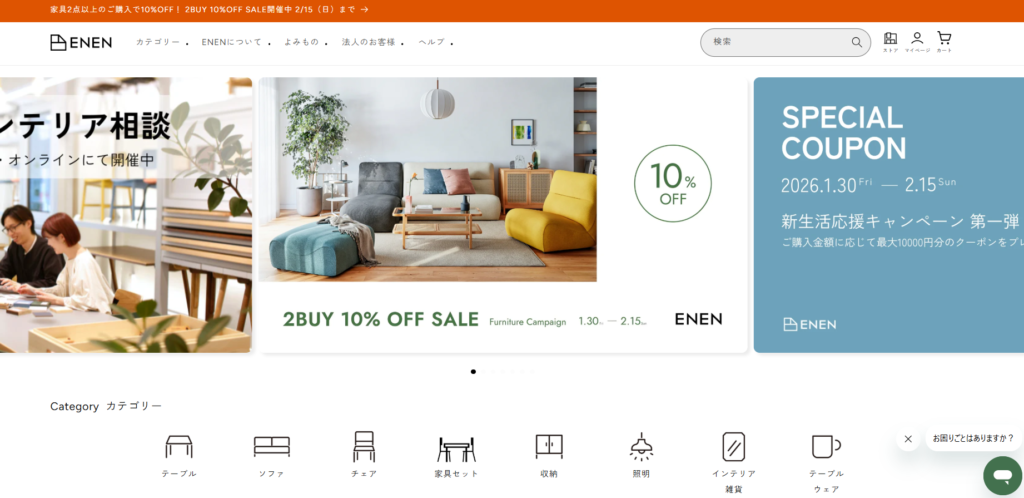 | 1位 | ENEN | ★★★★★(手ごろ) | ★★★★★ | ★★★★☆ | 2BUY 10%OFF 家具2点以上ご購入で10%OFF SALE開催! ※2026年2月15日まで | ◎ファミリー向けNo.1 |