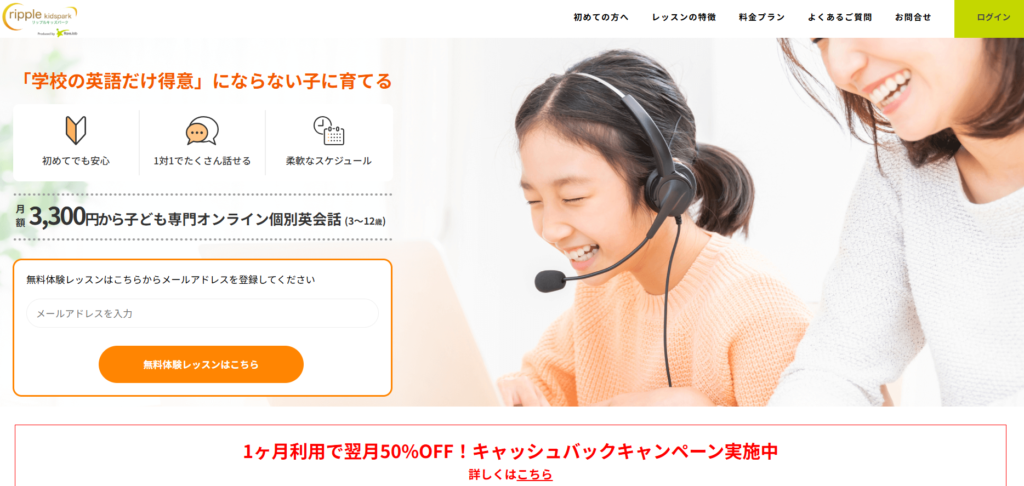 リップルキッズパークは、2009年創業の老舗オンライン英会話。3歳から中学生までを対象に、レベル別カリキュラムを展開しています。兄弟・家族でのアカウント共有が可能で、家庭での英語教育をサポートします。