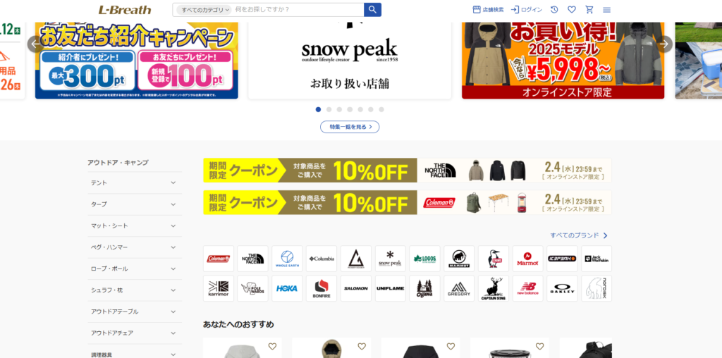 | エルブレス | アウトドア/スノー | 機能性重視の大型専門店 | ブランドやシーズンにより変動します。詳しくは公式サイトを要チェック | ◯ | セール・ポイントUP |