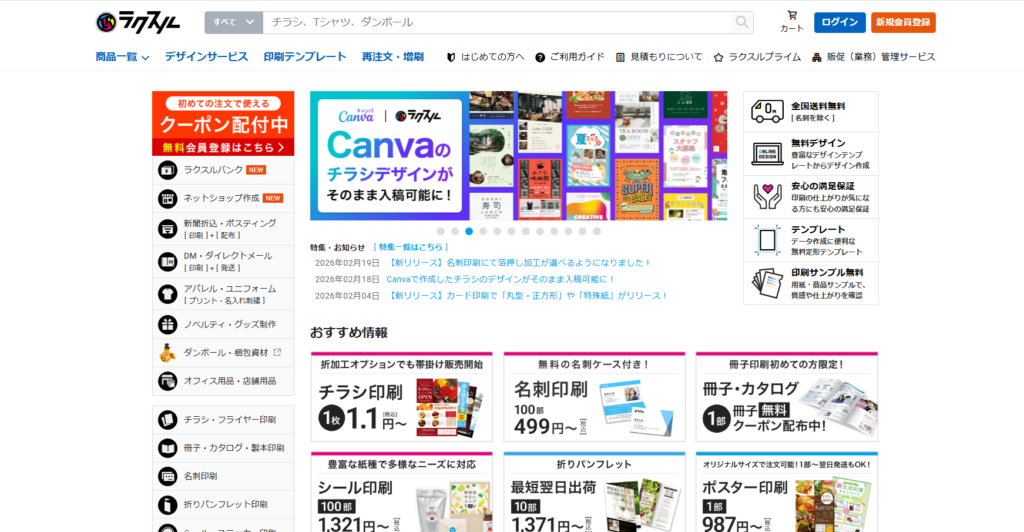 ラクスルは、印刷からポスティングまでをワンストップで依頼できる国内最大級のネット印刷サービスです。注文から入稿、配布エリア指定までオンラインで完結できるため、忙しい店舗オーナーでもスムーズに発注できます。全国規模の配布ネットワークを持ち、細かなエリア指定や部数調整が可能な点が大きな強みです。飲食店の新規オープン、不動産の物件案内、サロンのキャンペーン、診療所の開院告知など幅広い業種で利用実績があり、コストと利便性を両立したサービスとして高く評価されています。