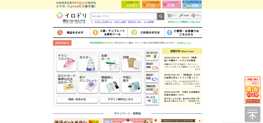 イロドリは、価格と品質のバランス型ネット印刷サービスです。小ロット印刷に対応しており、少部数から試したい店舗に適しています。オンライン入稿が可能で、比較的シンプルな料金体系を採用しています。ポスティングは別途対応ですが、初めてチラシ施策を試す店舗にとってハードルが低いサービスです。過度な大量発注を避けたい場合に適しています。
