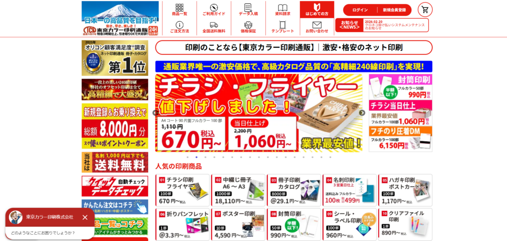 東京カラー印刷は、短納期対応に強みを持つ印刷会社です。急ぎ案件や期間限定キャンペーンなど、スピードを重視する販促に適しています。オンライン注文に対応しており、納期プランも複数から選択可能です。ポスティングは別途手配となりますが、印刷スピードを優先したい場合に検討価値があります。時間的余裕がないケースで活躍するサービスです。