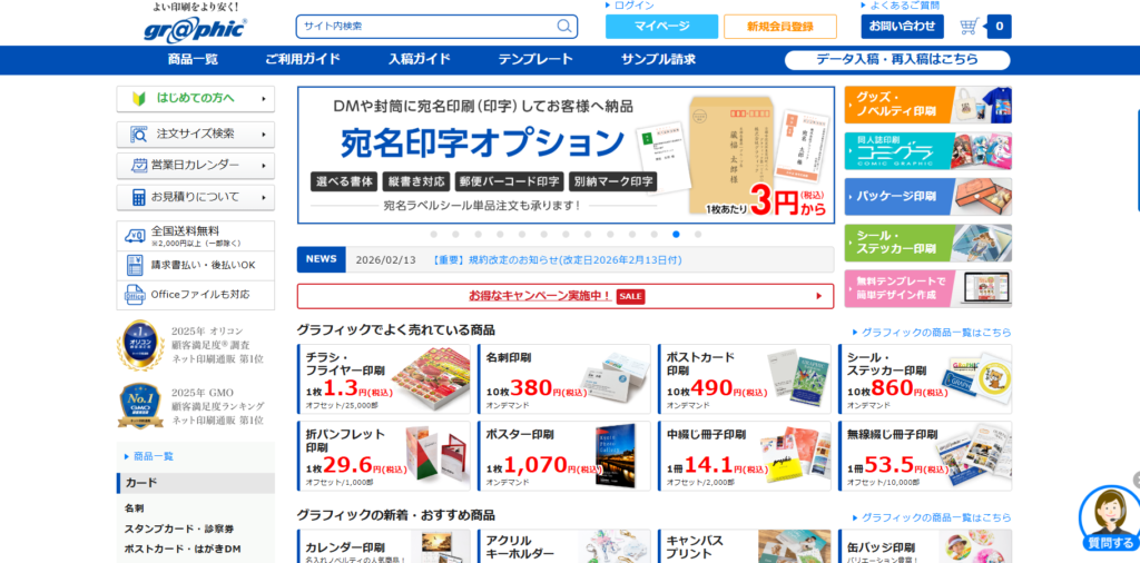 グラフィックは、高品質印刷に定評のあるネット印刷会社です。発色や紙質のバリエーションが豊富で、デザイン性を重視する店舗に向いています。テンプレートや入稿サポートも充実しており、ブランドイメージを大切にする業種に選ばれています。ポスティングは別途対応ですが、見た目の印象を重視するチラシ制作には強みがあります。美容系や高価格帯サービスの販促と相性が良いサービスです。