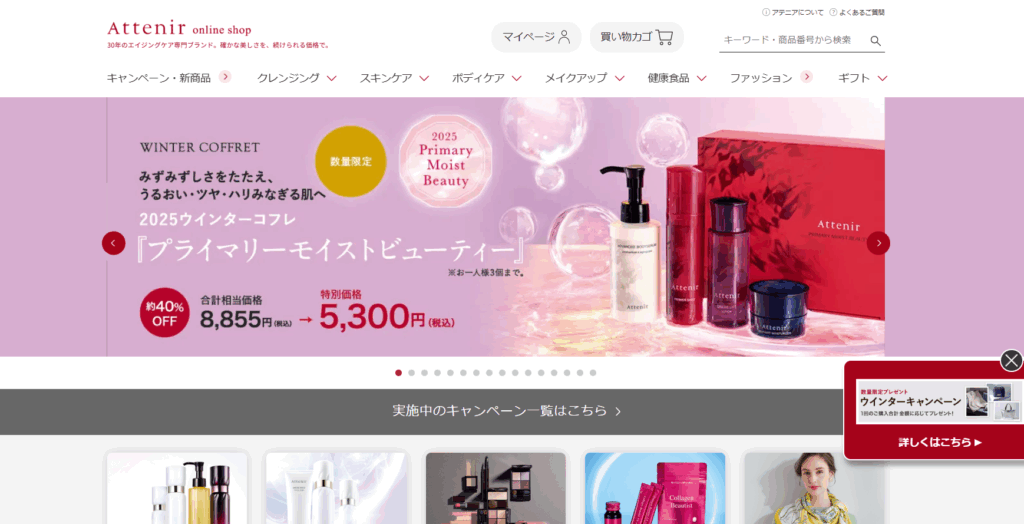 アテニアは「高品質を低価格で」を掲げるブランドで、無添加処方とエイジングケアの両立が魅力。
